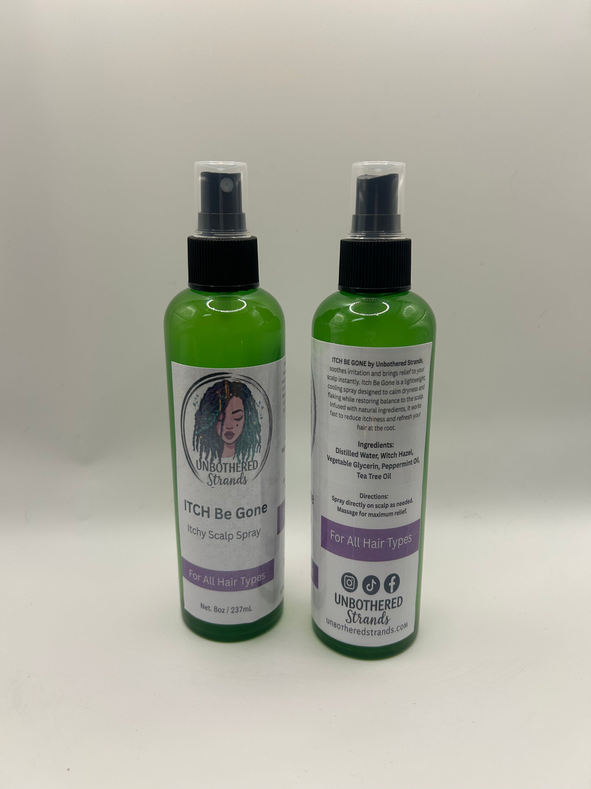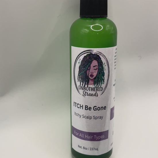 (8oz)Itch be Gone by UNBOTHERED STRANDS soothes irritation and brings relief to your scalp instantly. Itch be gone is a lightweight, cooling spray designed to calm dryness and flaking while restoring balance to the scalp. Infused with natural ingredients, it works fast to reduce itchiness and refresh your hair at the root.